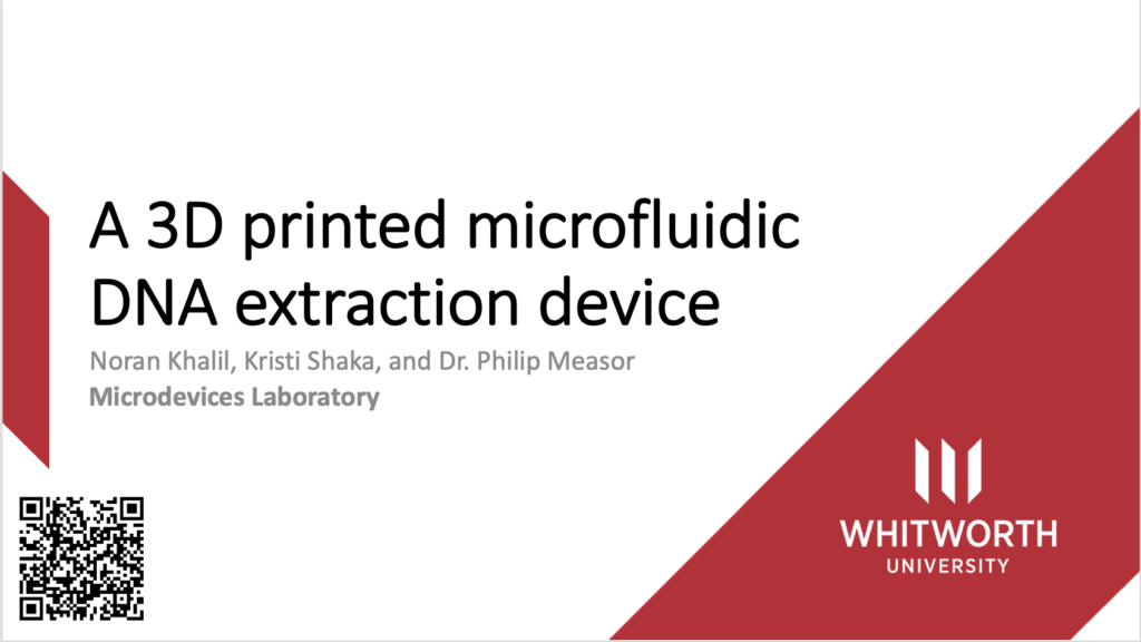 Khalil continued her research and submitted to the SPIE Conference, an international conference focused on optics and photonics hosted in San Francisco, California this year. She was accepted as one of the only undergraduate presenters, giving a 20-minute talk on her research, titled, “A 3D printed Microfluidic DNA extraction device.”